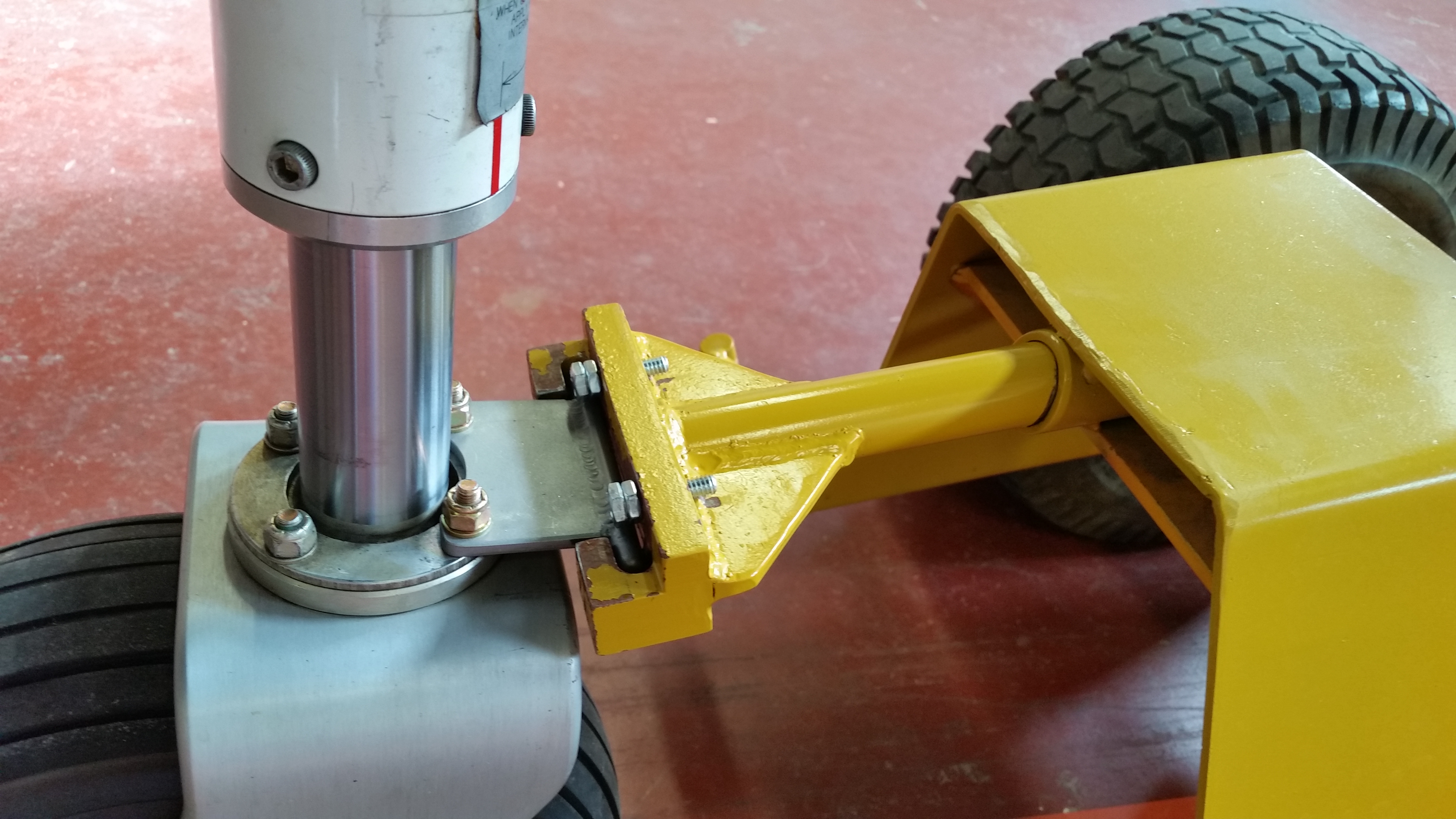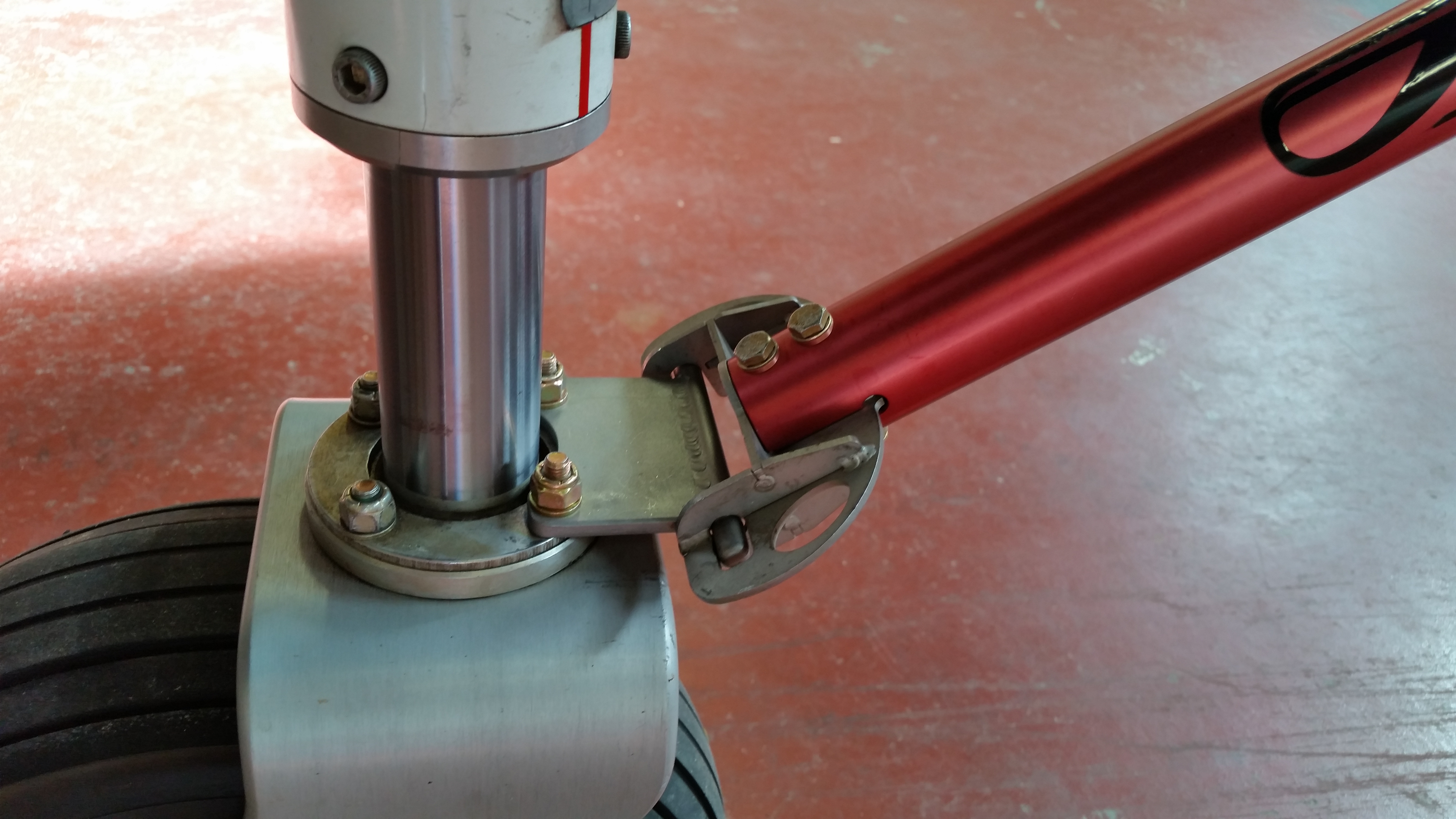 Paul, not sure what the difference is but mine doesn't interfere at all, with either the tow bar or the tug. The dimensions of my newly fabricated plate were taken directly from the original one. I wonder if dimensional changes were made by the factory somewhere along the line when they put the 45 deg bend in the plate, given that your tow bar interferes with the nose gear fork???